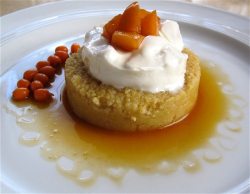 Sanddorn-Couscous mit Birnenquarkcreme an Sanddornsauce, dazu Gewürzaprikosen und frische Sanddornbeeren.